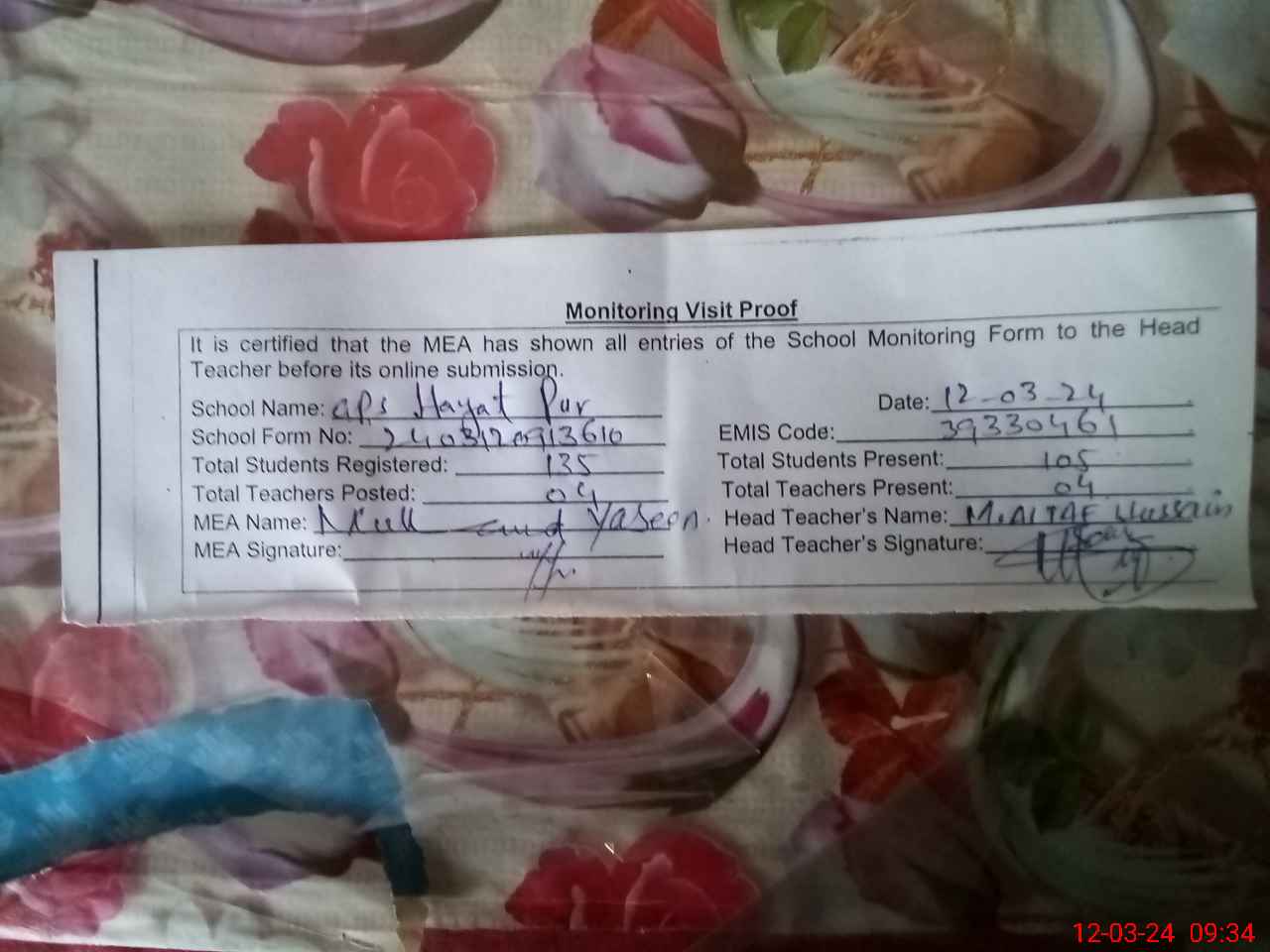 | Attendance Register | Head Teacher | MEA with School | Visit Proof |