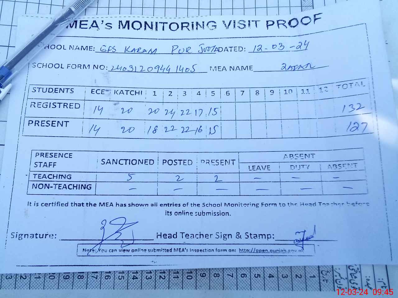 | Attendance Register | Head Teacher | MEA with School | Visit Proof |