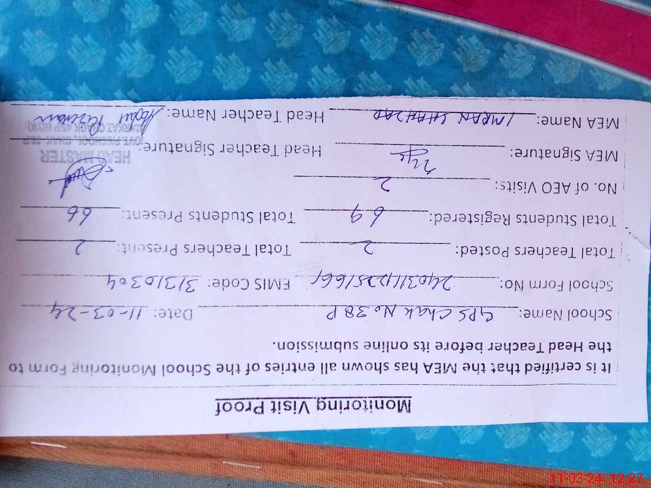 | Certified that this School was Inspected by the Undersigned MEA/DMO Today and the Information Stated Above is as Per Record. | |||||