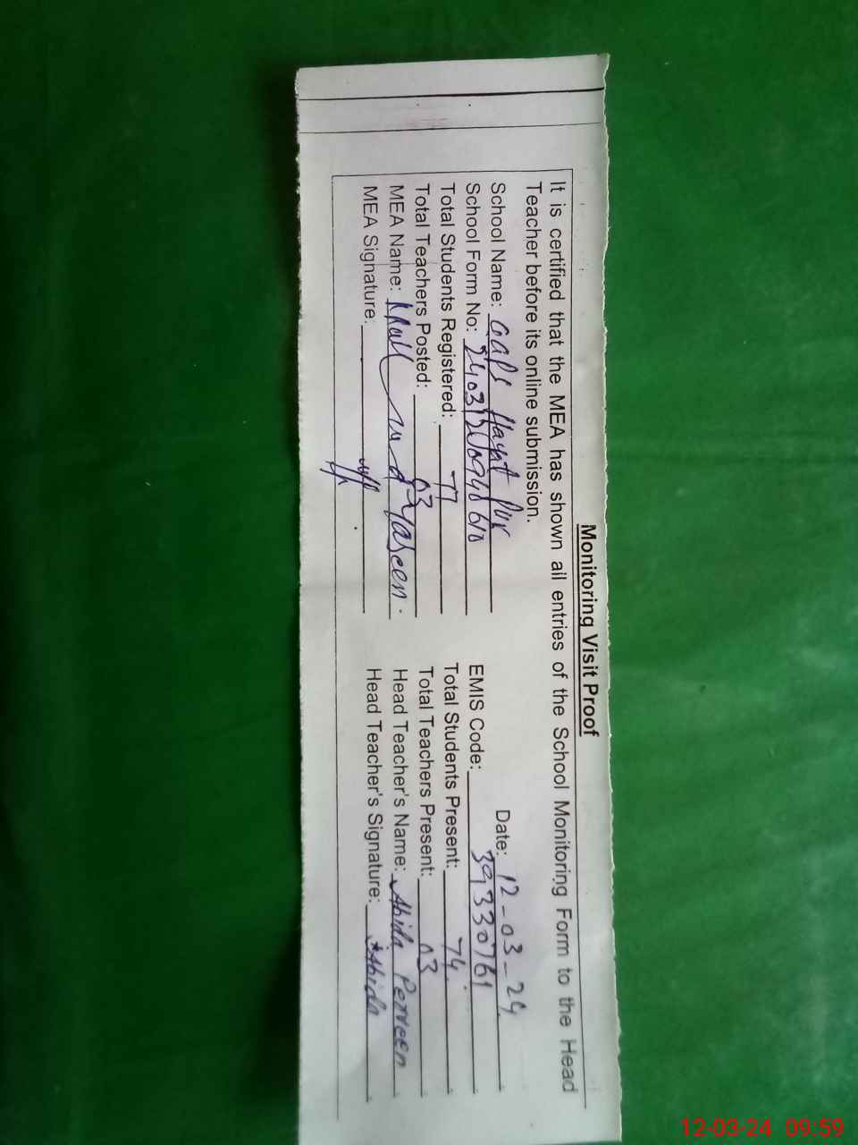| Attendance Register | Head Teacher | MEA with School | Visit Proof |