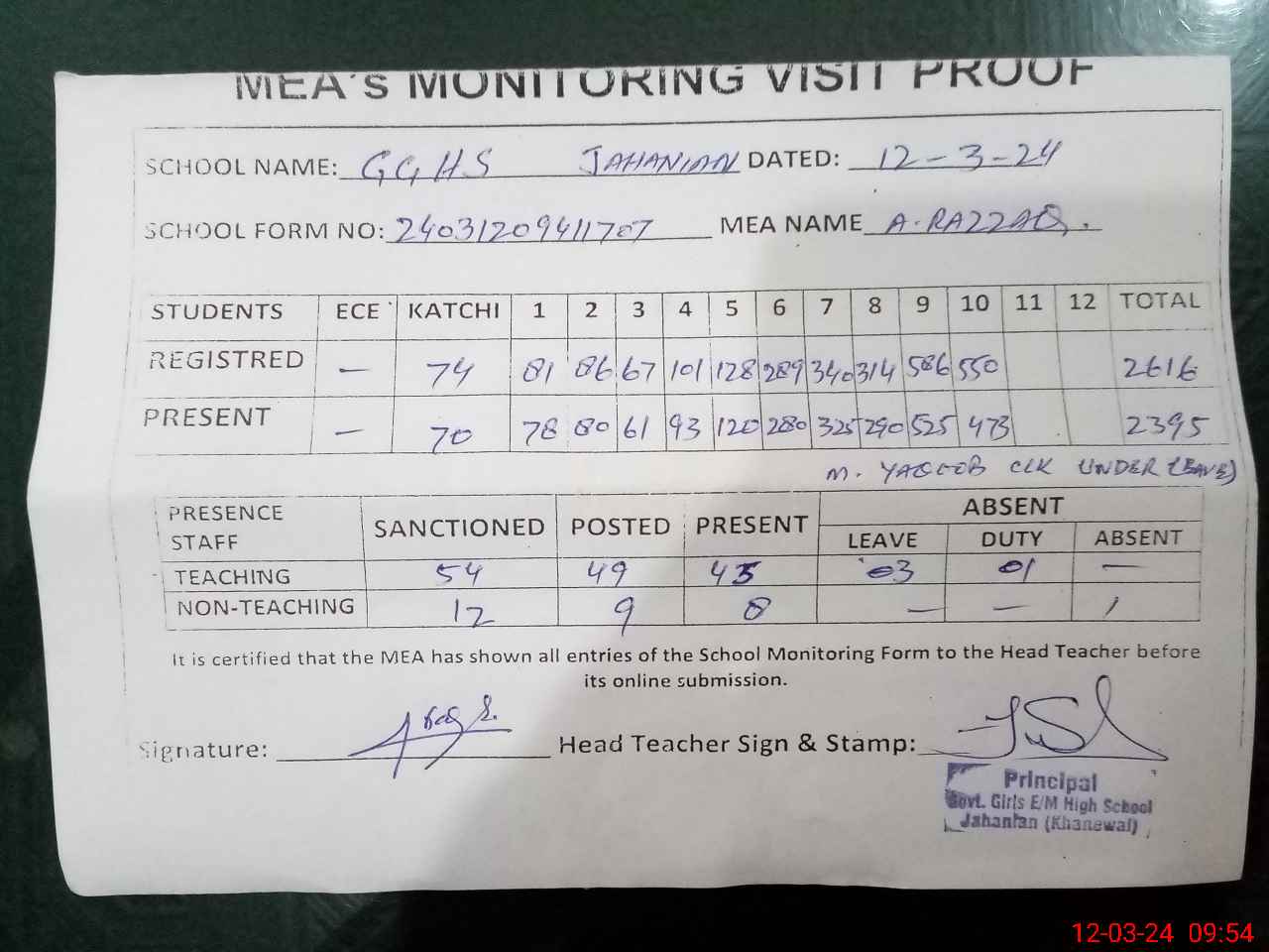 | Attendance Register | Head Teacher | MEA with School | Visit Proof |