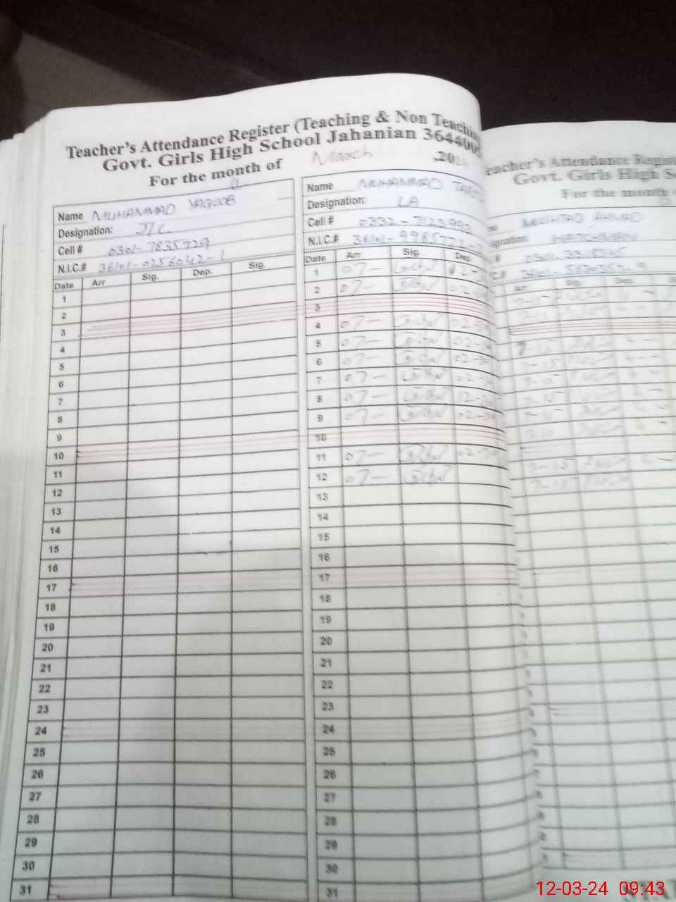 | CNIC | Full Name | Designation | R/C | Absence During Last Calender Month |