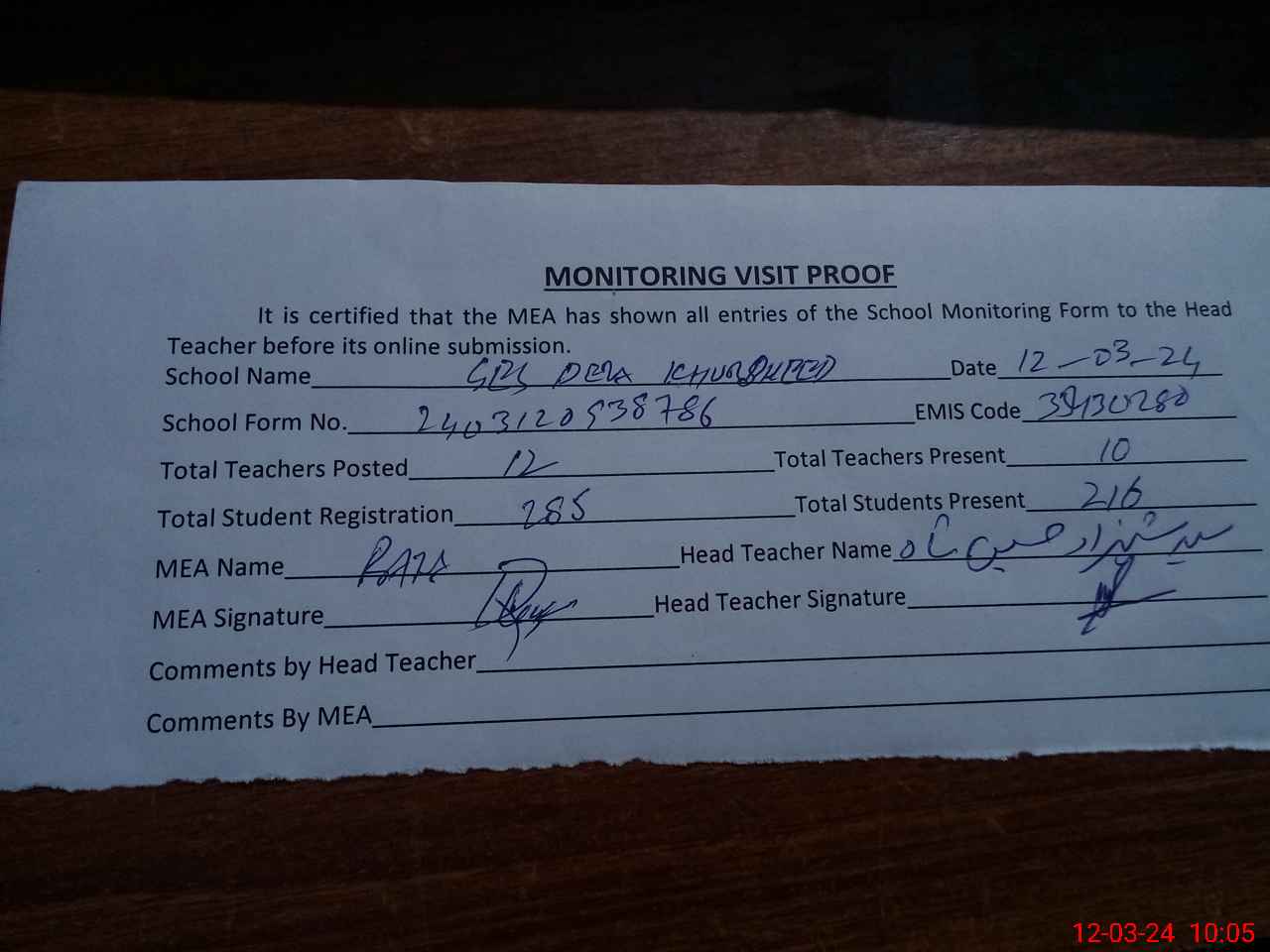 | EMIS Code: 35430280 | Name of School: GES DERA KHURSHEED HIRAN MINAR | |||