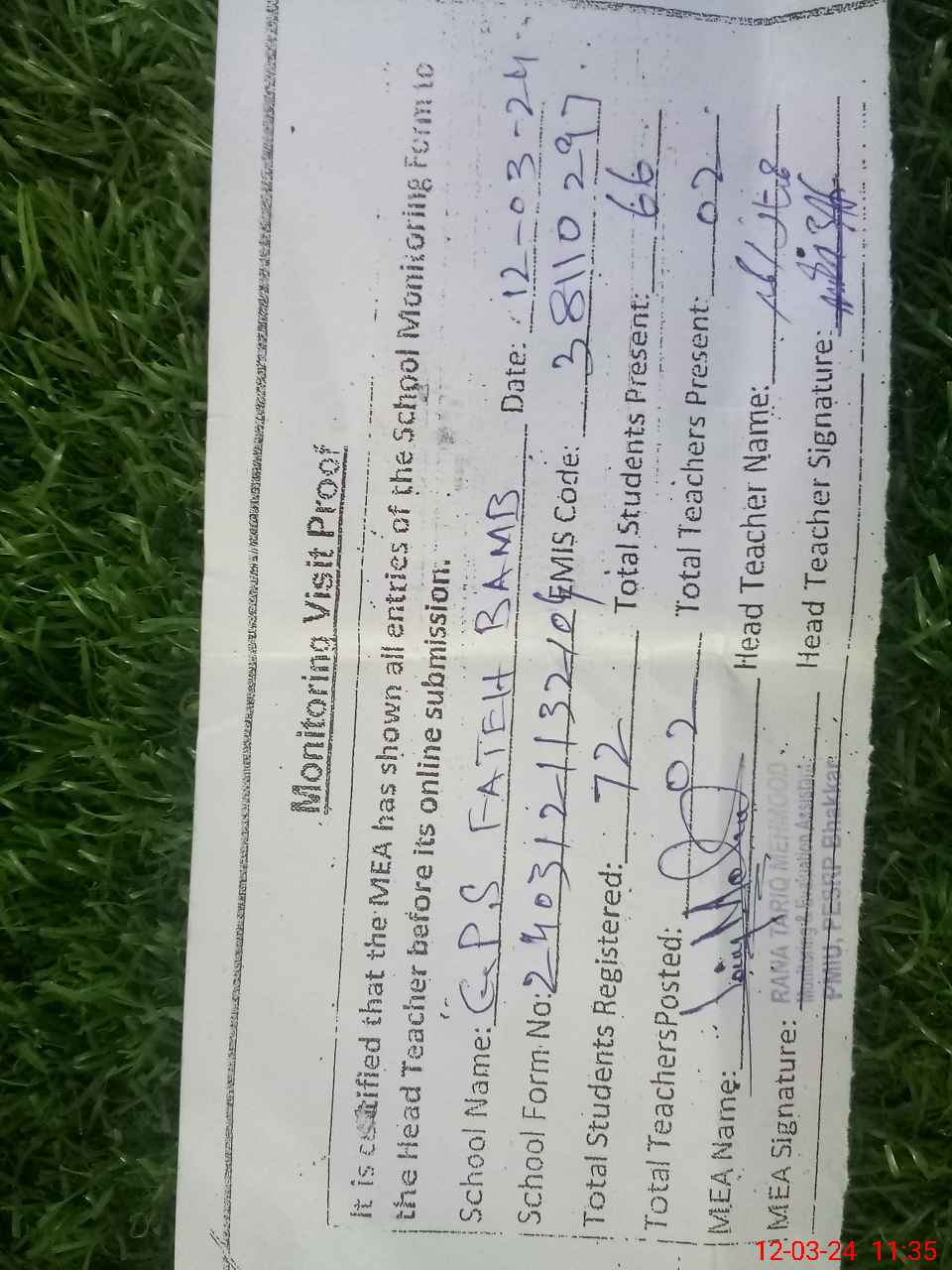 | EMIS Code: 38110297 | Name of School: GPS FATEH BUMB | |||