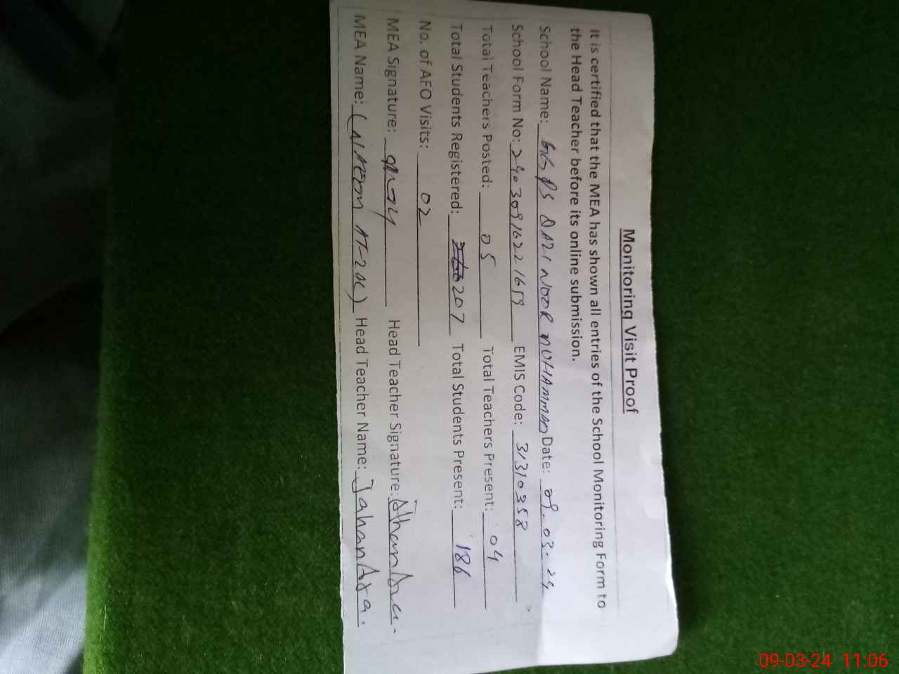 | Attendance Register | Head Teacher | MEA with School | Visit Proof |