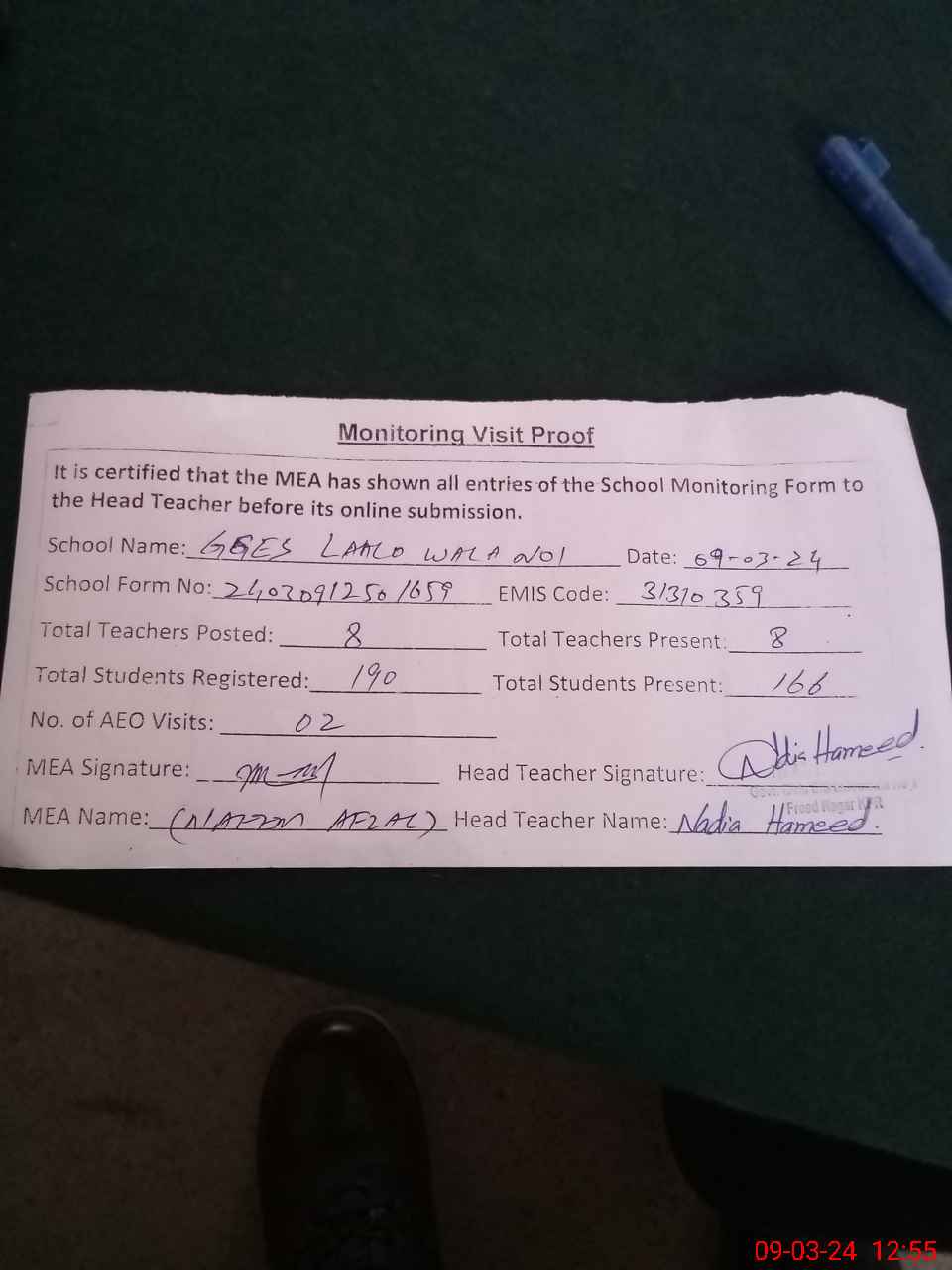 | Attendance Register | Head Teacher | MEA with School | Visit Proof |