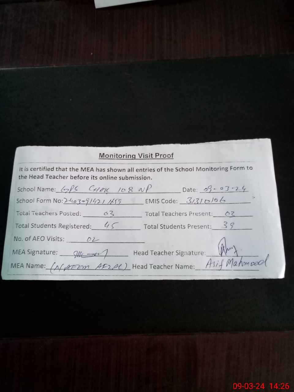 | Attendance Register | Head Teacher | MEA with School | Visit Proof |