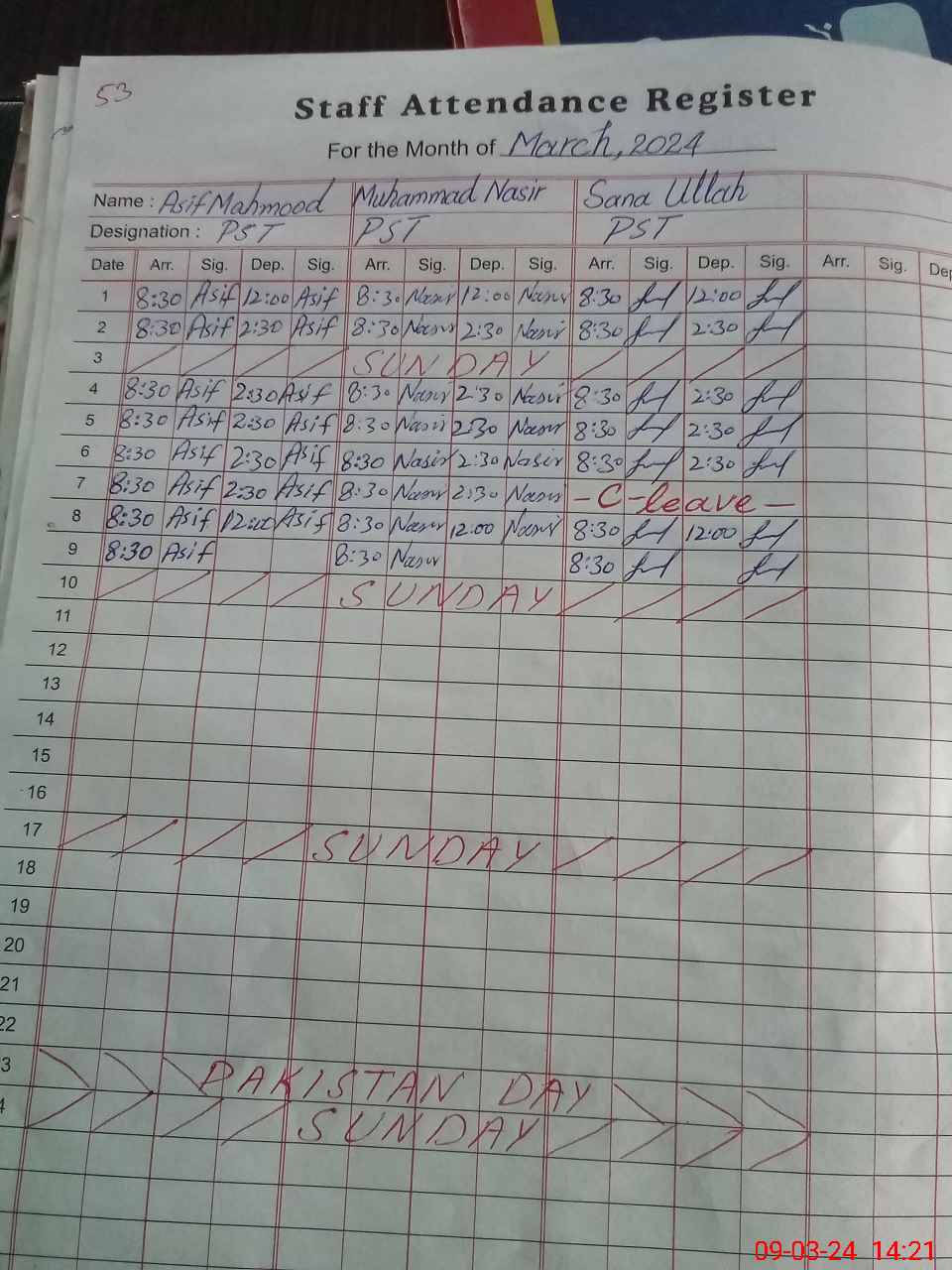 | CNIC | Full Name | Designation | R/C | Absence During Last Calender Month |