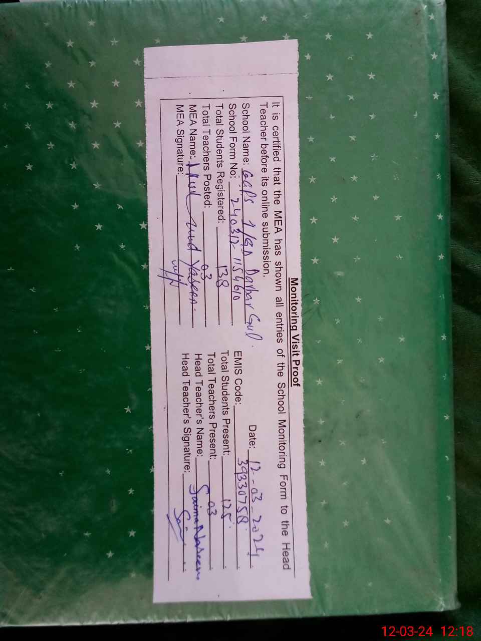| Attendance Register | Head Teacher | MEA with School | Visit Proof |