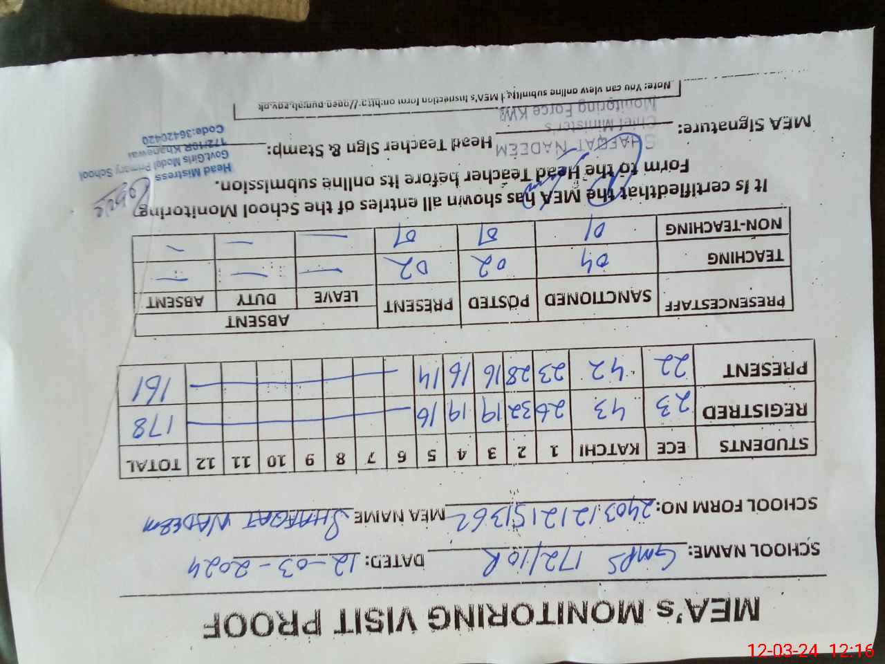 | Attendance Register | Head Teacher | MEA with School | Visit Proof |