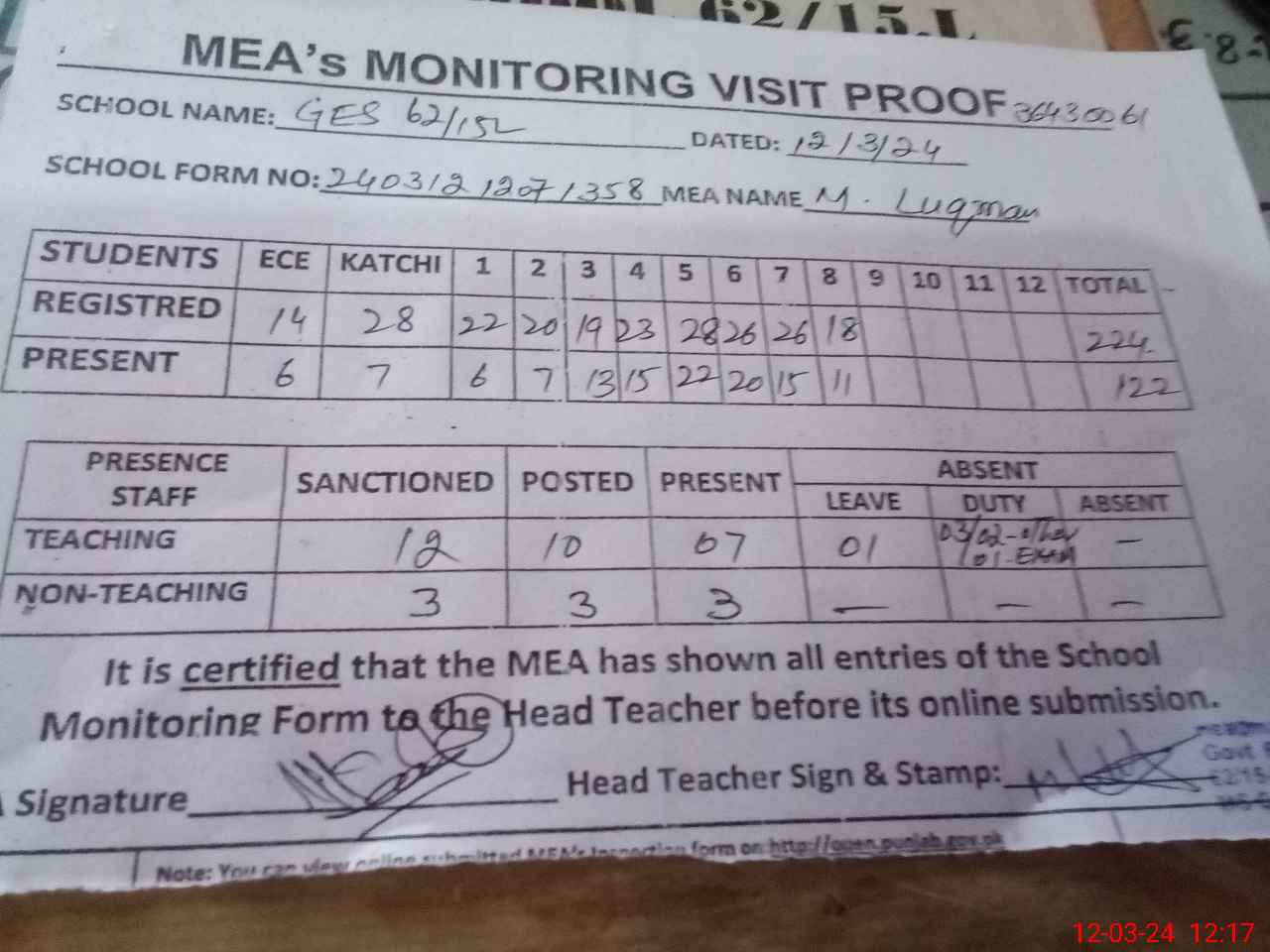 | Attendance Register | Head Teacher | MEA with School | Visit Proof |
