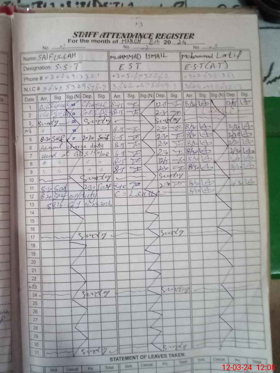| CNIC | Full Name | Designation | R/C | Absence During Last Calender Month |