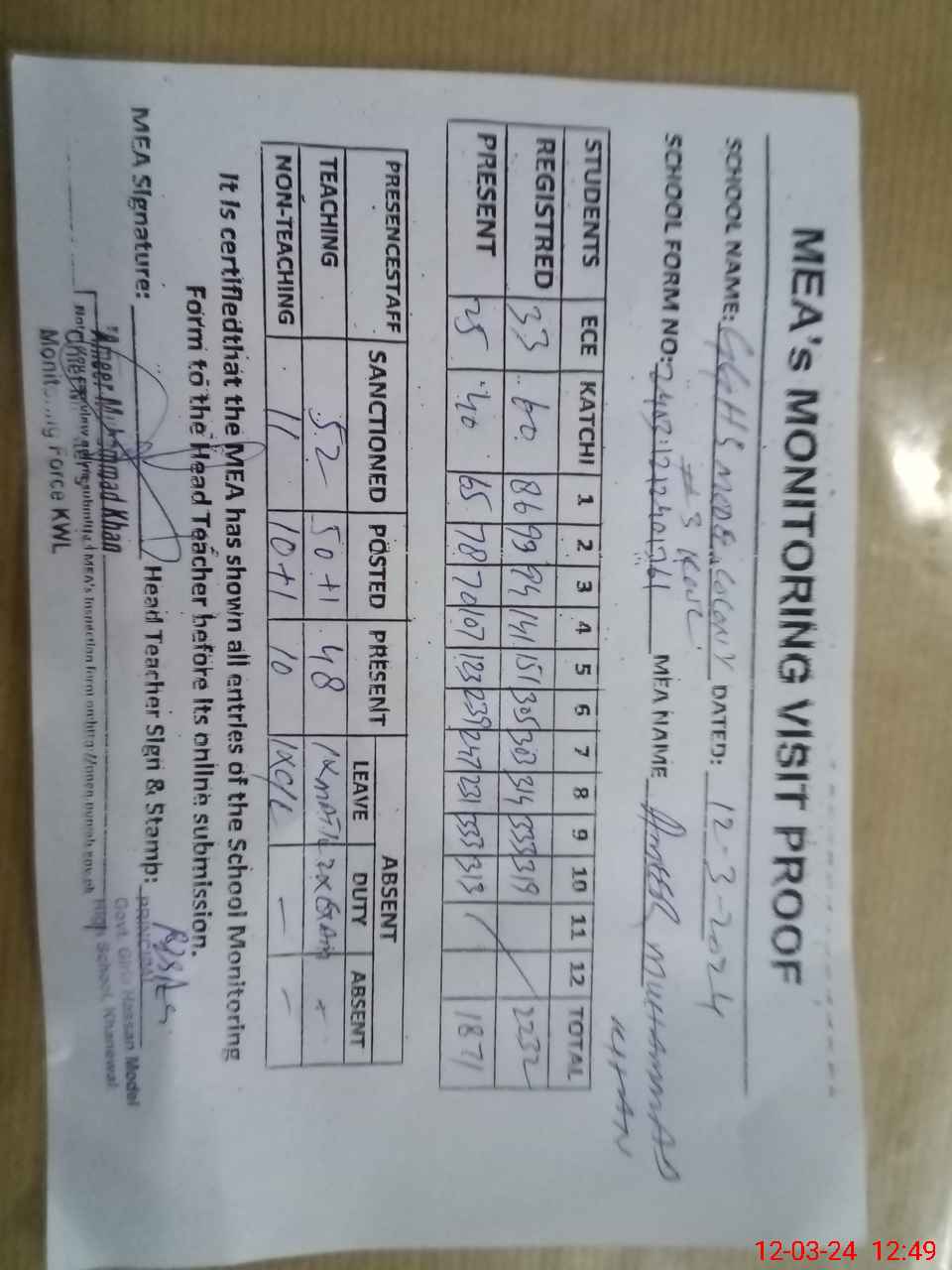 | Certified that this School was Inspected by the Undersigned MEA/DMO Today and the Information Stated Above is as Per Record. | |||||