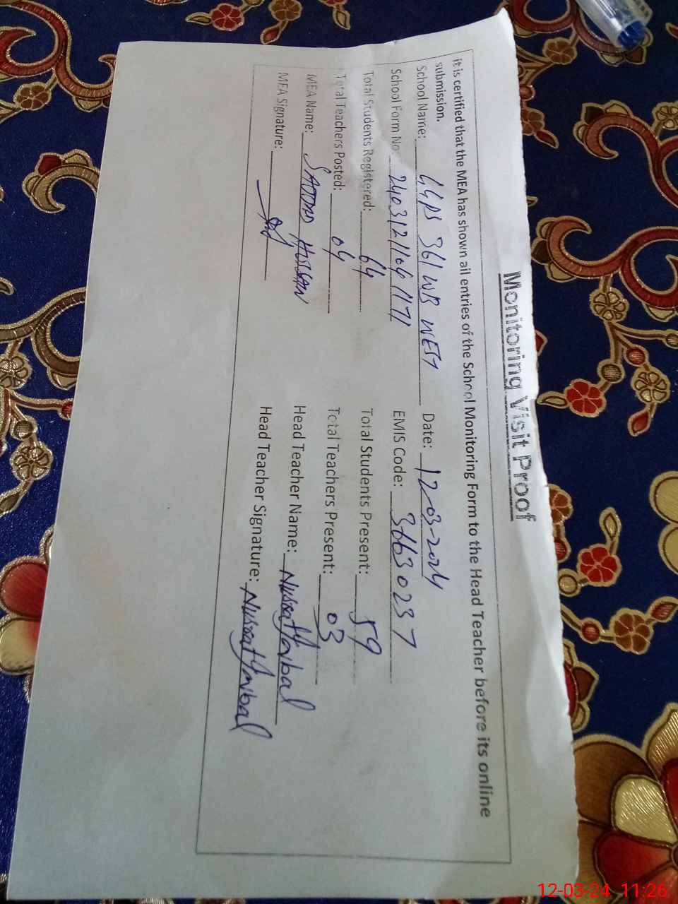 | Attendance Register | Head Teacher | MEA with School | Visit Proof |