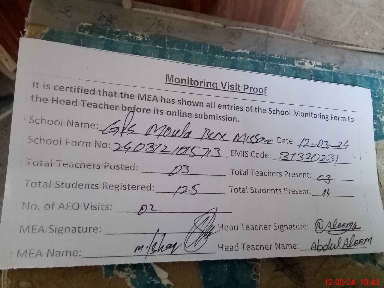 | EMIS Code: 31320231 | Name of School: GPS MOULA BUX MISSAN | |||