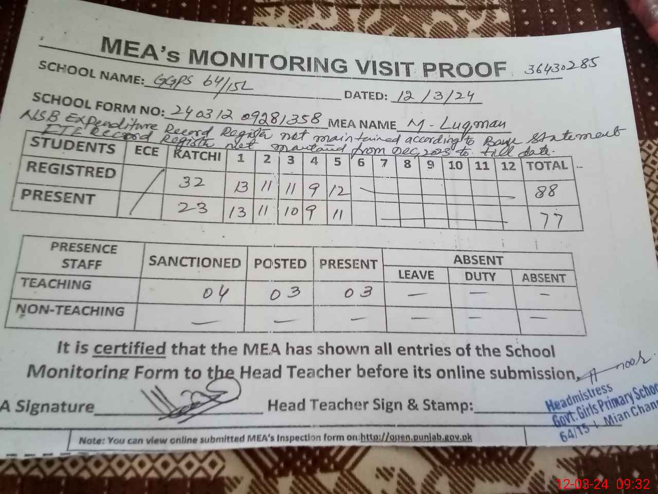 | EMIS Code: 36430285 | Name of School: GGPS 64/15-L MIAN CHANNU | |||