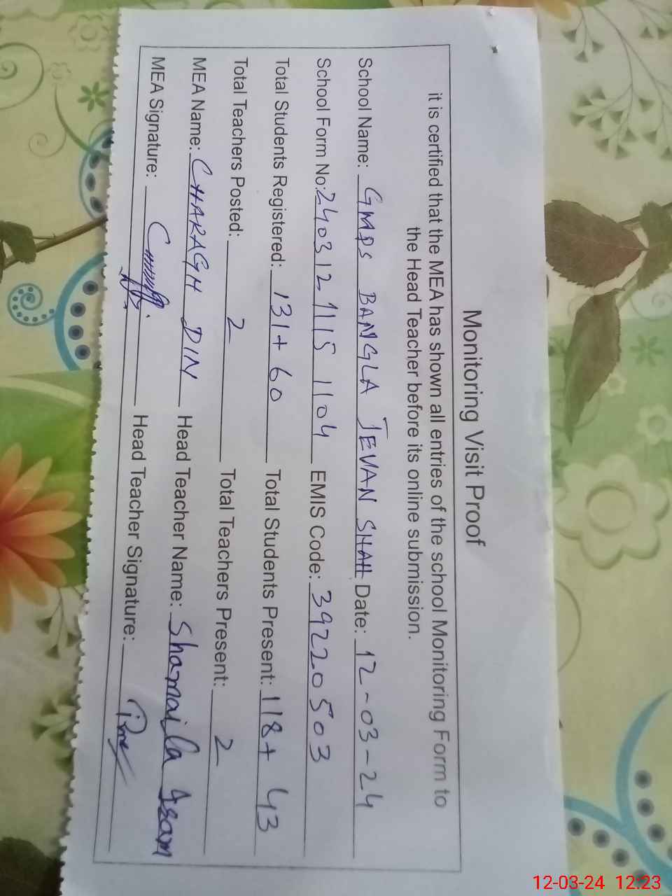 | EMIS Code: 39220503 | Name of School: GMPS BANGLA JEVAN SHAH | |||