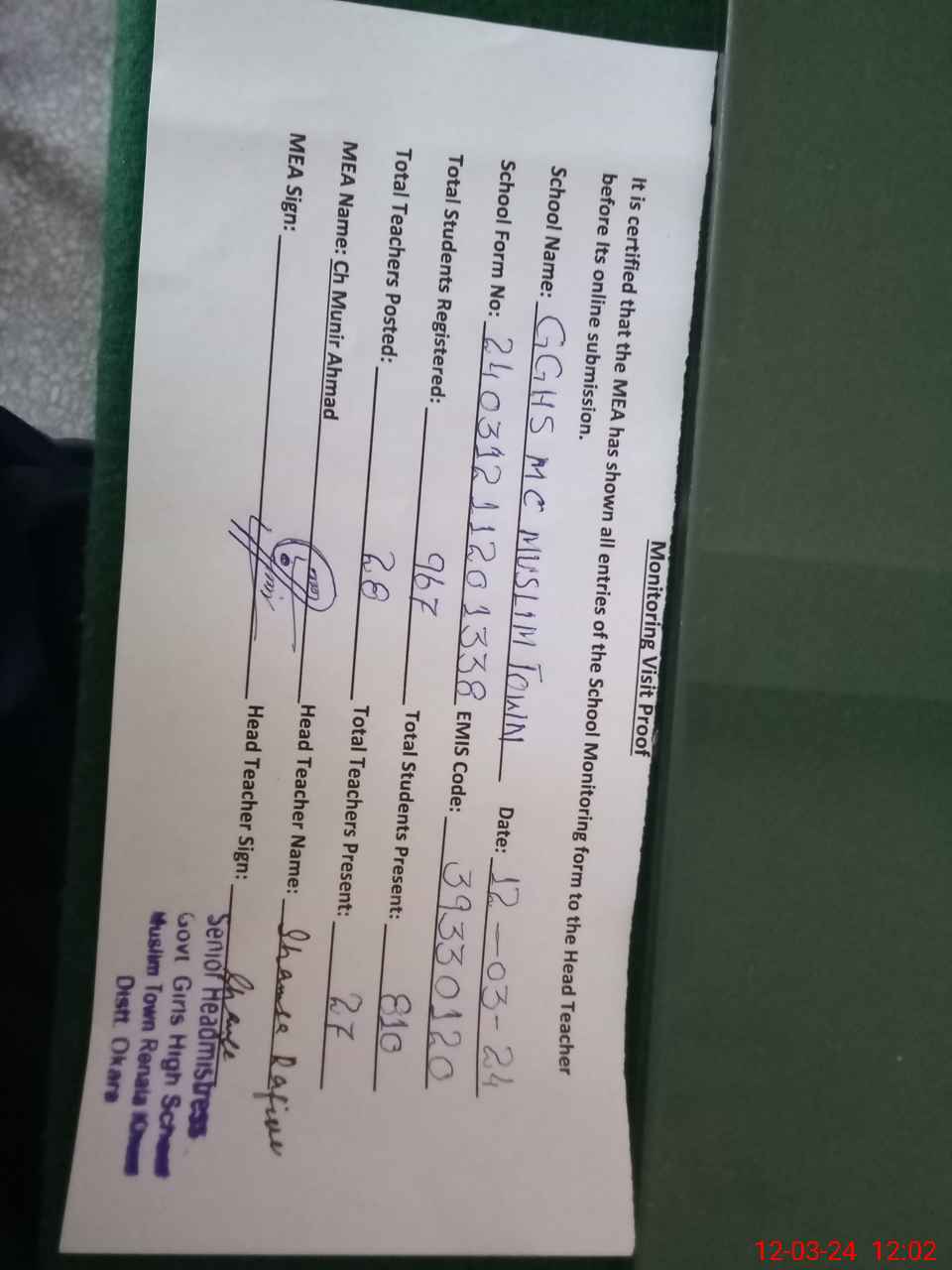 | EMIS Code: 39330120 | Name of School: GGHS MC MUSLIM TOWN RENALA KHURD | |||