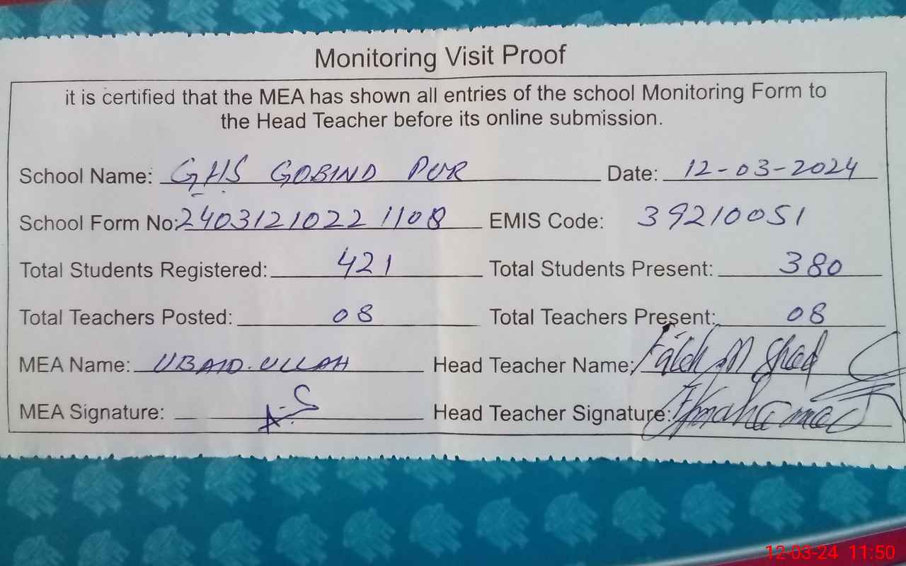 | EMIS Code: 39210051 | Name of School: GHS GOBIND PUR P/O GOBIND PUR | |||