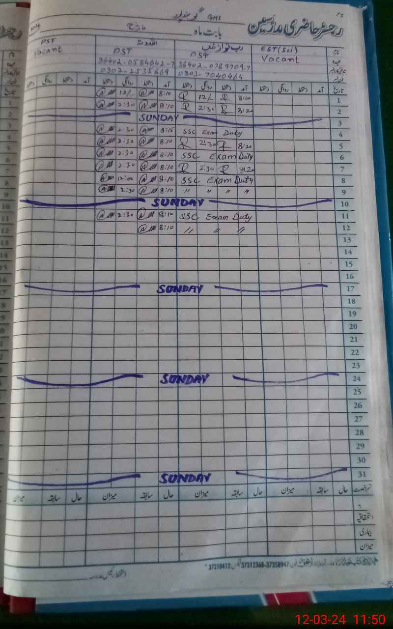 | 36**** | Ra**** Na**** Kh**** | PST | Regular | 3 | 0 | 0 | 0 | 0 | 0 | 0 | 0 | 3 | Exam Duty |