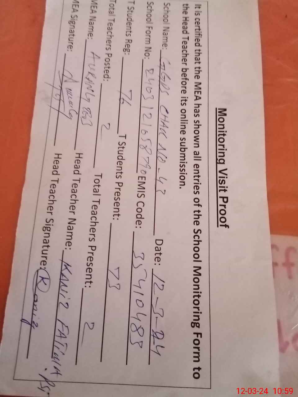 | Attendance Register | Head Teacher | MEA with School | Visit Proof |