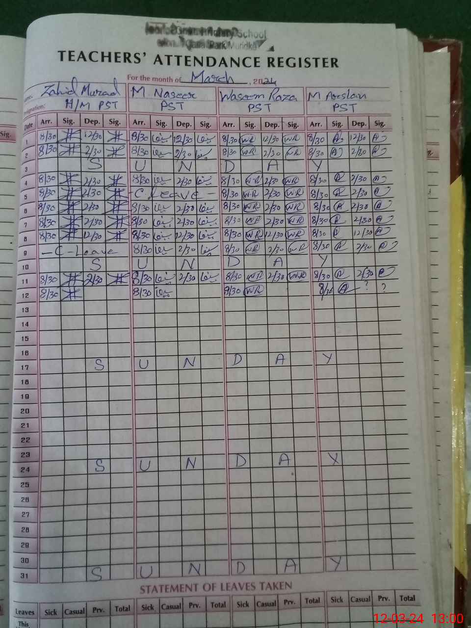 | CNIC | Full Name | Designation | R/C | Absence During Last Calender Month |