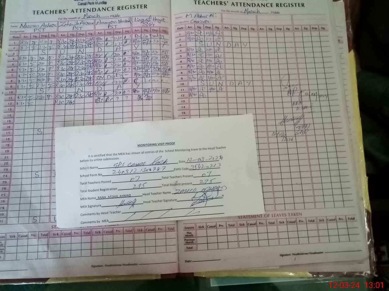 | Attendance Register | Head Teacher | MEA with School | Visit Proof |