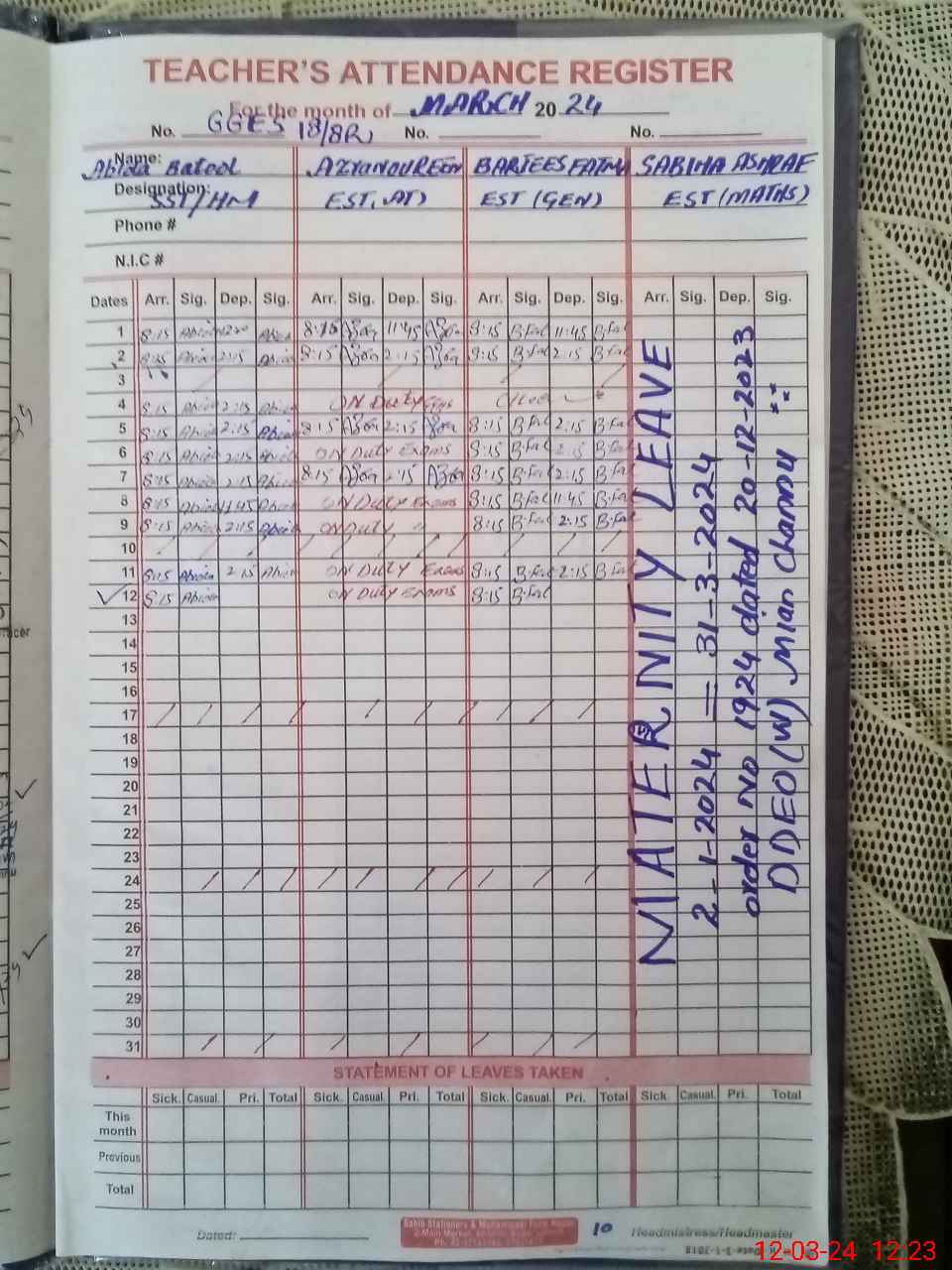 | 36**** | Az**** No**** | Regular | 5 | 1 | 0 | 0 | 0 | 0 | 0 | 0 | 5 | Exam Duty | |