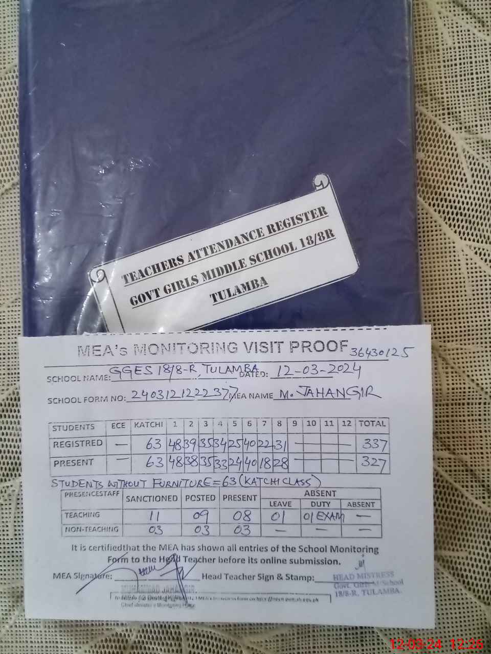 | Attendance Register | Head Teacher | MEA with School | Visit Proof |