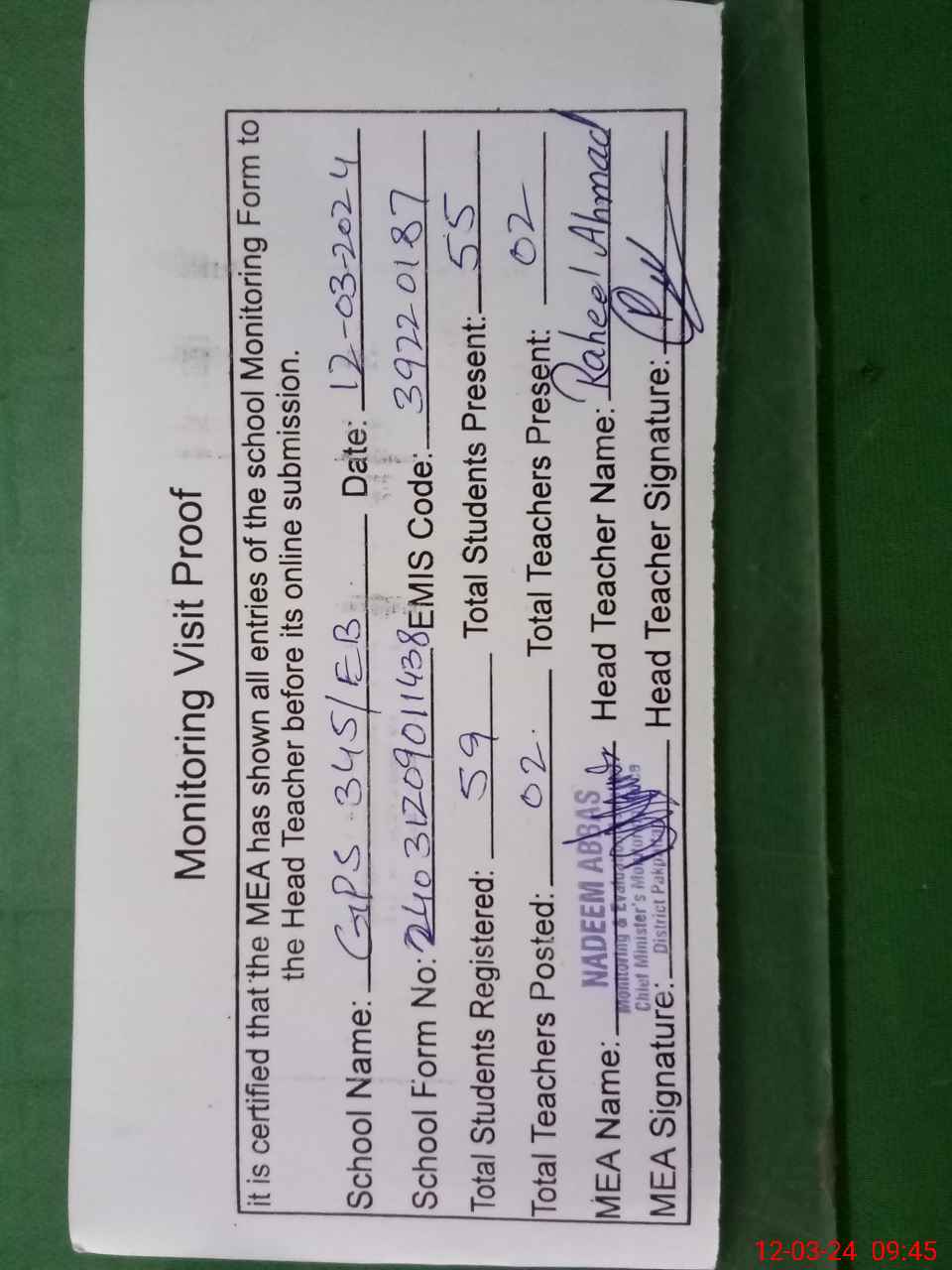 | Attendance Register | Head Teacher | MEA with School | Visit Proof |