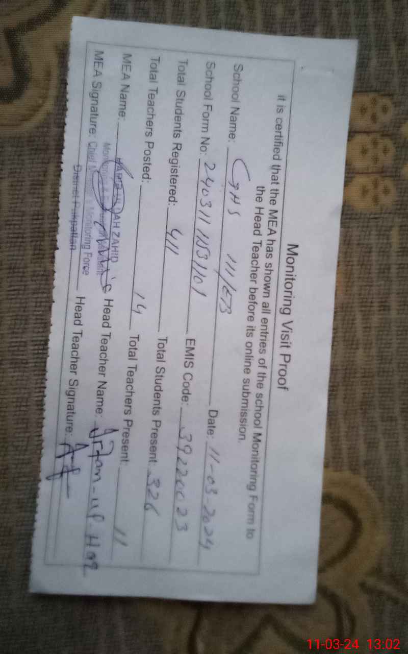 | Attendance Register | Head Teacher | MEA with School | Visit Proof |