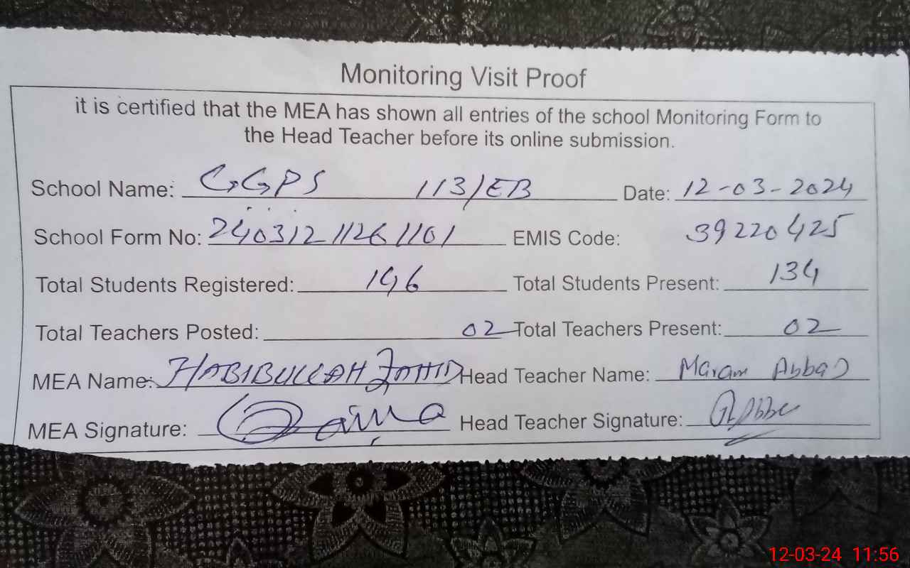 | EMIS Code: 39220425 | Name of School: GGPS 113 EB | |||
