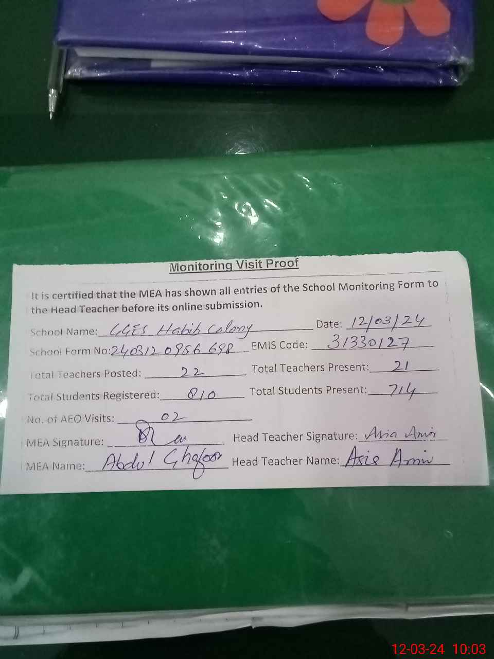 | Attendance Register | Head Teacher | MEA with School | Visit Proof |