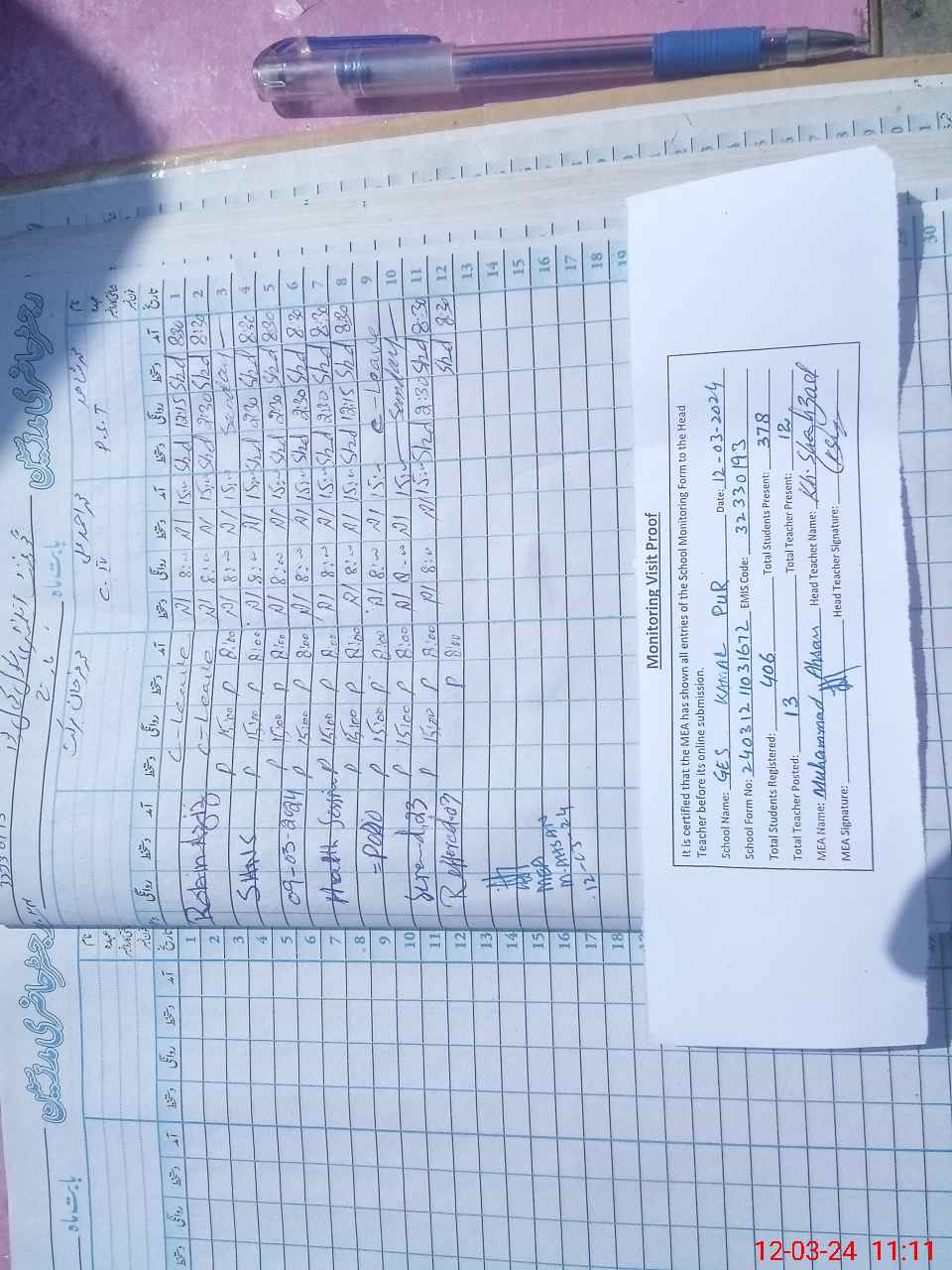 | Attendance Register | Head Teacher | MEA with School | Visit Proof |