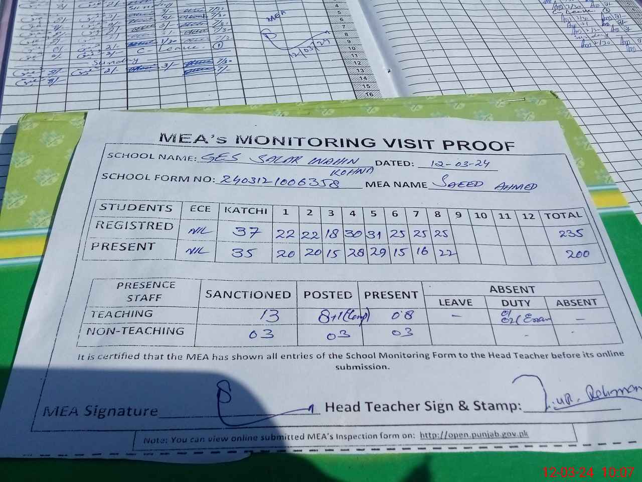 | Attendance Register | Head Teacher | MEA with School | Visit Proof |