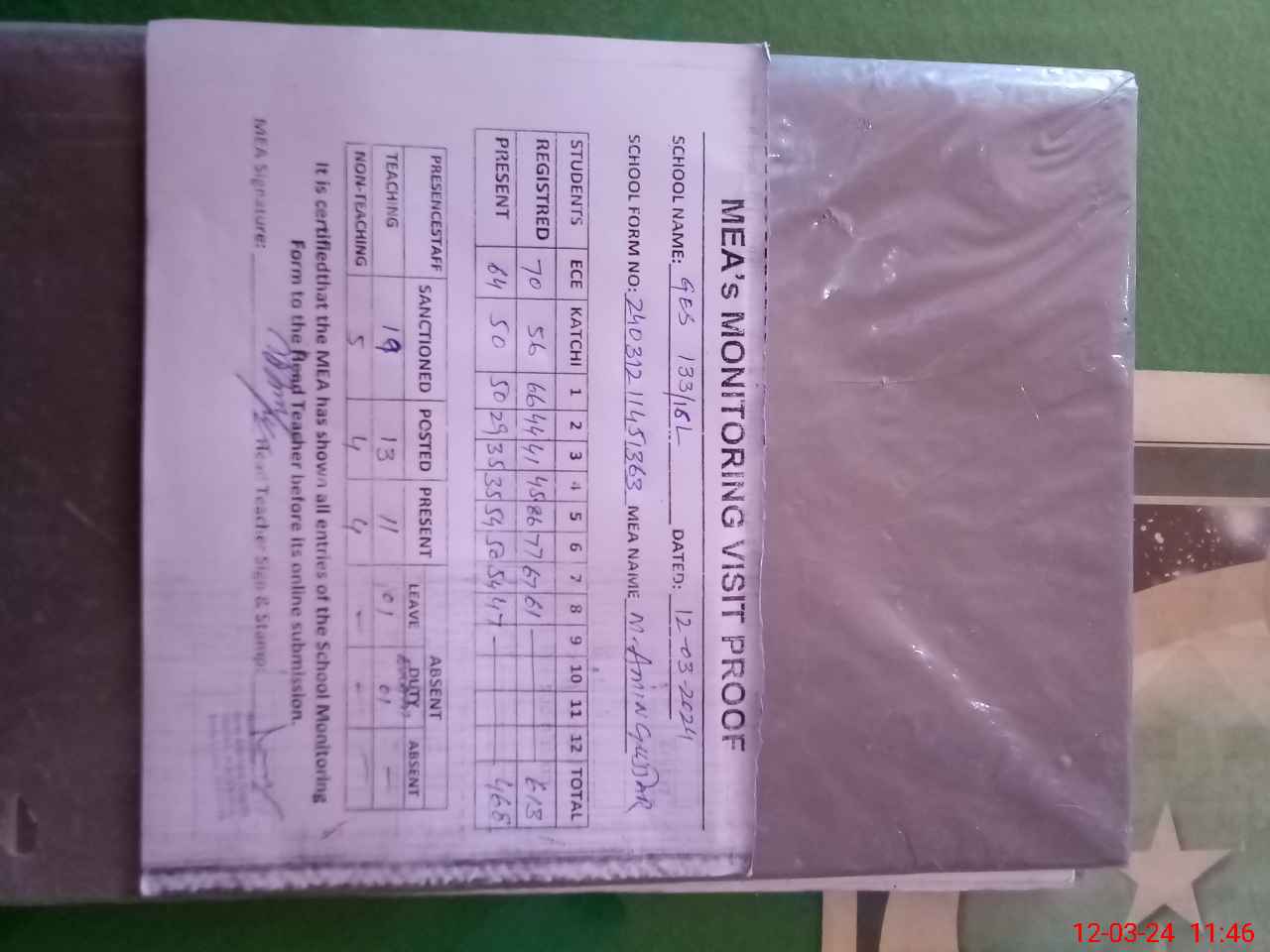 | Attendance Register | Head Teacher | MEA with School | Visit Proof |