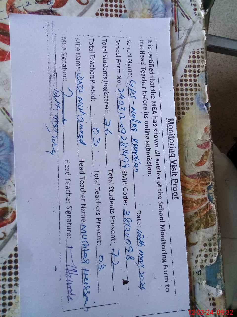 | Attendance Register | Head Teacher | MEA with School | Visit Proof |
