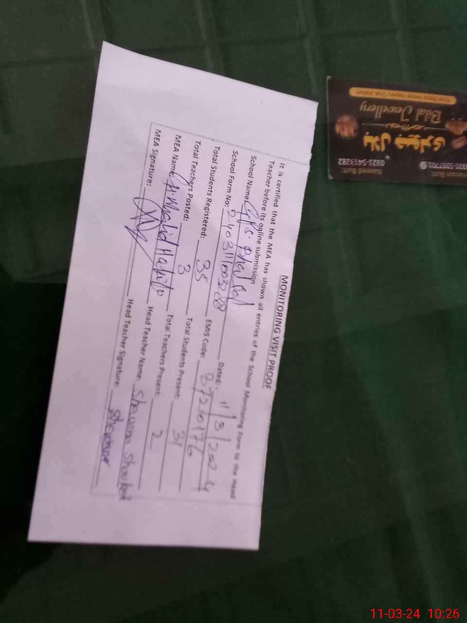 | Attendance Register | Head Teacher | MEA with School | Visit Proof |