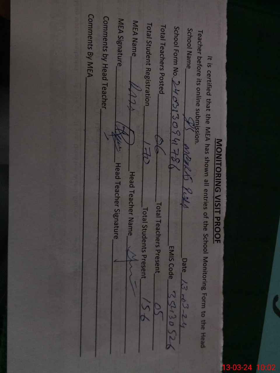 | Certified that this School was Inspected by the Undersigned MEA/DMO Today and the Information Stated Above is as Per Record. | |||||