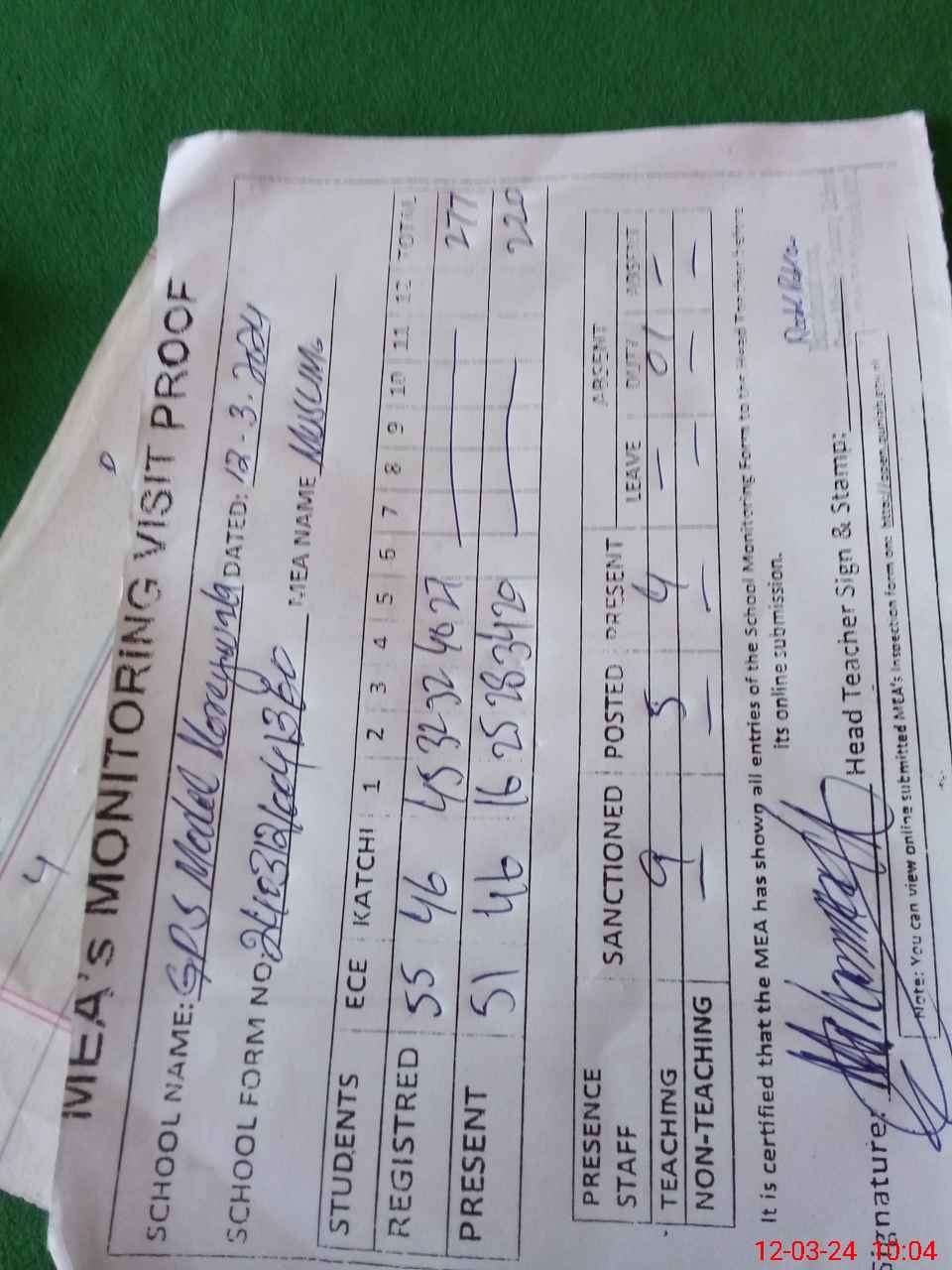 | Attendance Register | Head Teacher | MEA with School | Visit Proof |