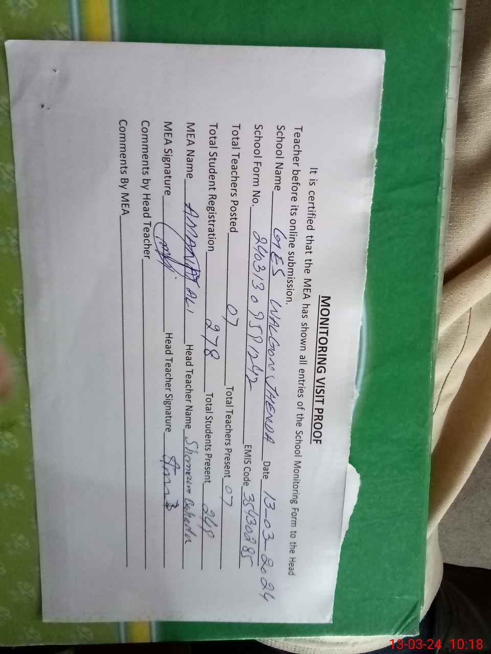 | Attendance Register | Head Teacher | MEA with School | Visit Proof |