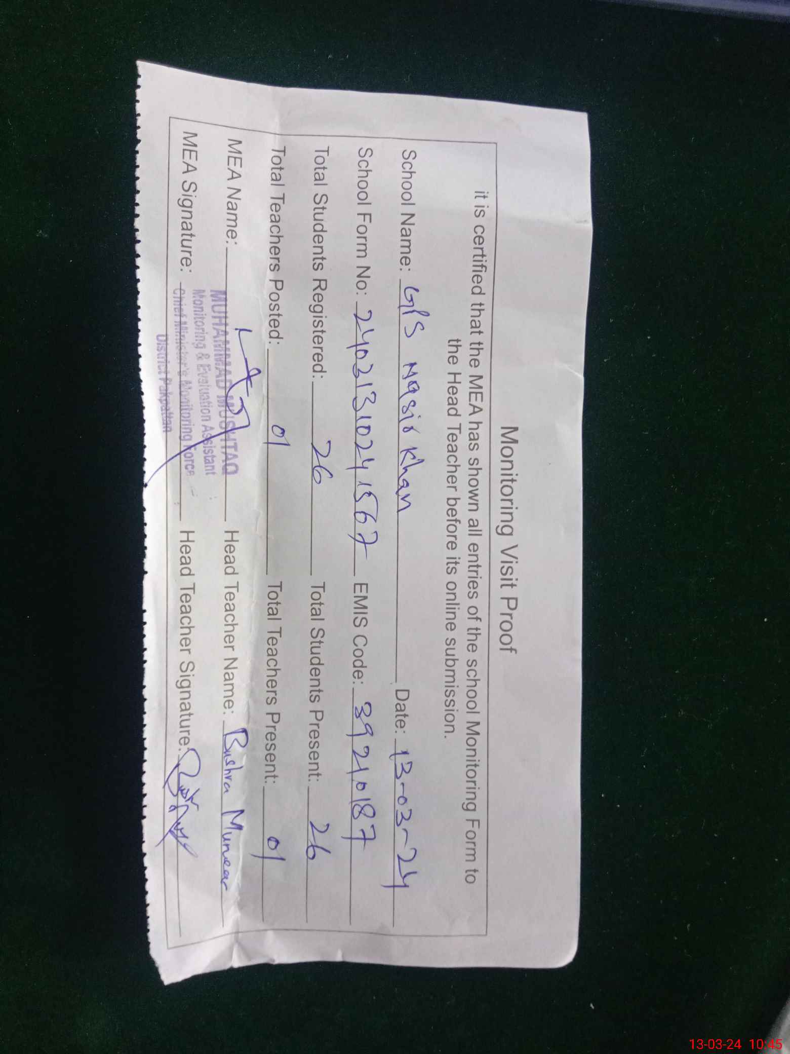 | Certified that this School was Inspected by the Undersigned MEA/DMO Today and the Information Stated Above is as Per Record. | |||||