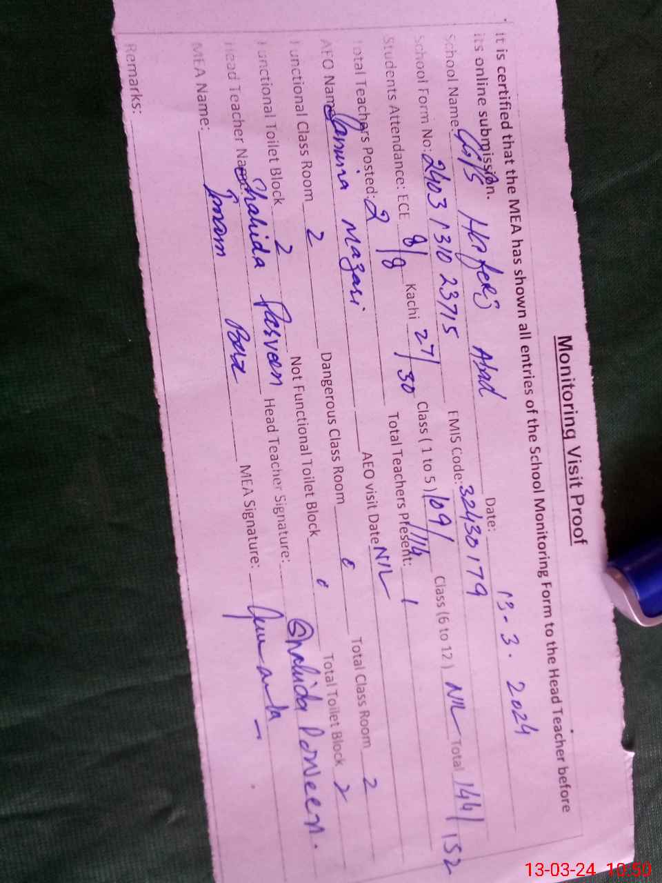 | Name: SH**** PE**** Designation: (School Headmaster's/Headmistress's) Headmisstress Phone/Cell Number: 03**** |