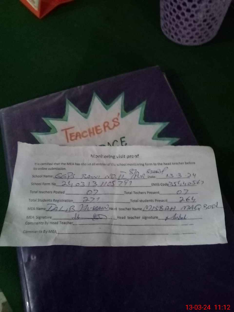 | Attendance Register | Head Teacher | MEA with School | Visit Proof |