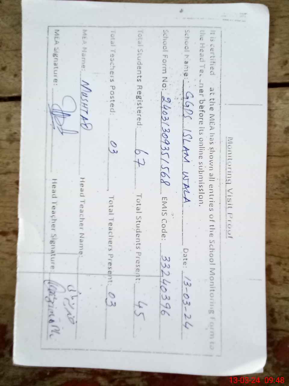 | EMIS Code: 33240396 | Name of School: GGPS ISLAM WALA | |||