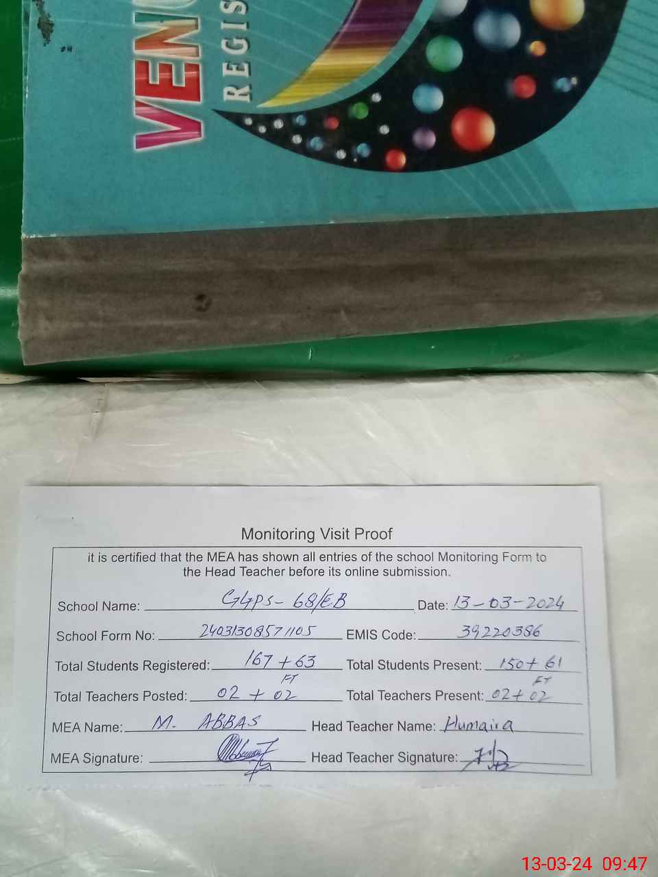 | Attendance Register | Head Teacher | MEA with School | Visit Proof |