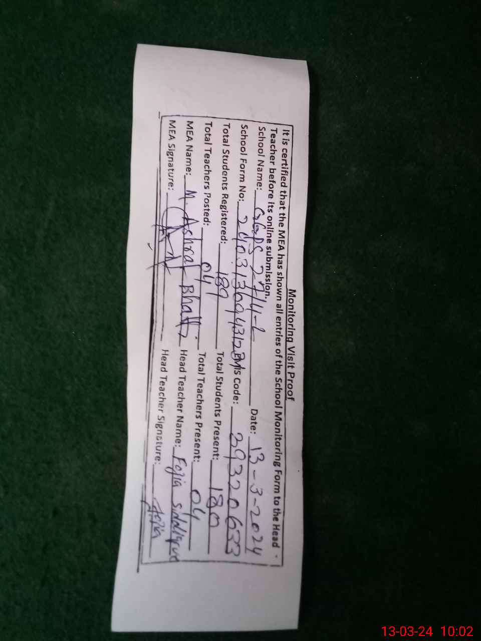 | Attendance Register | Head Teacher | MEA with School | Visit Proof |