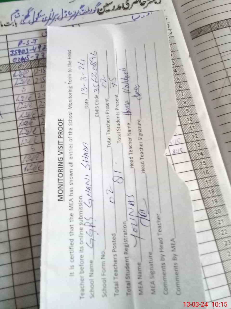 | Attendance Register | Head Teacher | MEA with School | Visit Proof |