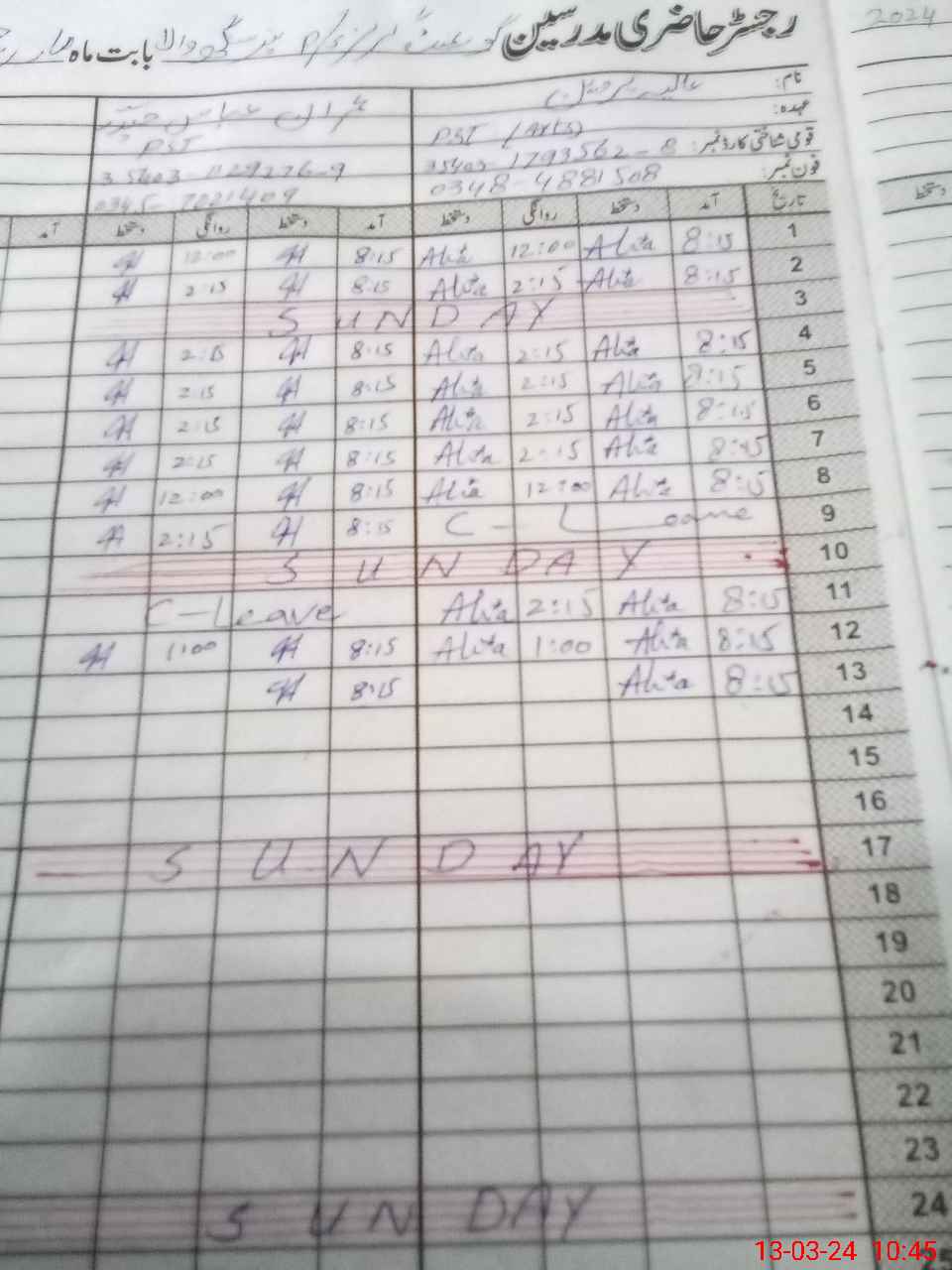 | CNIC | Full Name | Designation | R/C | Absence During Last Calender Month |