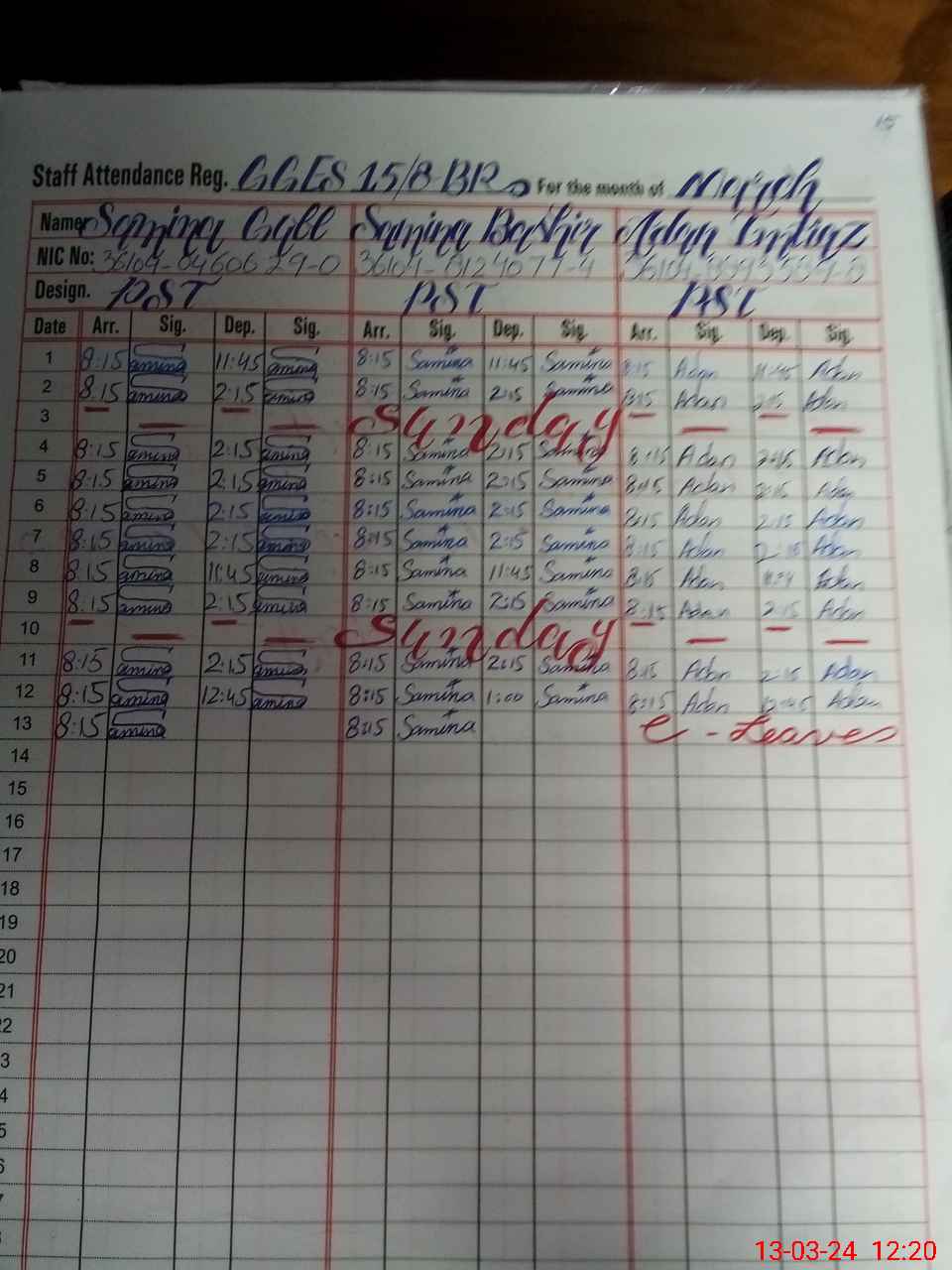 | CNIC | Full Name | Designation | R/C | Absence During Last Calender Month |